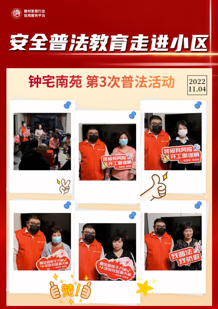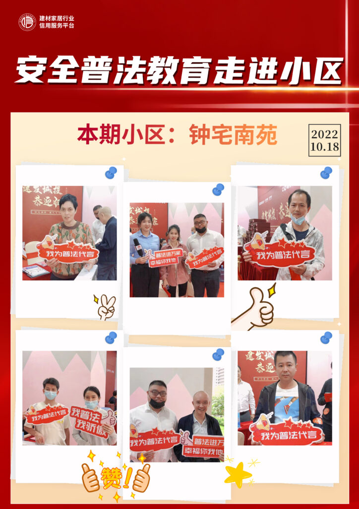 建材家居行业信用服务平台(简称装修信用平台)自10月中旬起,开展了一系列的安全普法宣传活动。